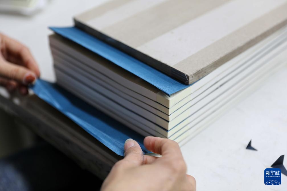 2月19日,工作人员在泾县三希堂线装文化园装订车间制作宣纸线装书。新华社记者 曹力 摄